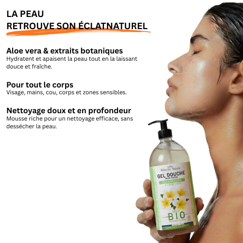 Les gels douche à l’Aloe Vera BIO par Helvetia Natura nettoient la peau en douceur.